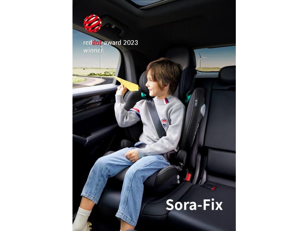 Veselá, pastelově zelená, dětská autosedačka Avova SORA-FIX je schválena podle R-129 pro děti s výškou 100-150 cm, přibližně od 3 do 12 let. Lze ji instalovat po směru jízdy k ISOFIXu vozidla. Vítěz Reddot Design Award 2023.